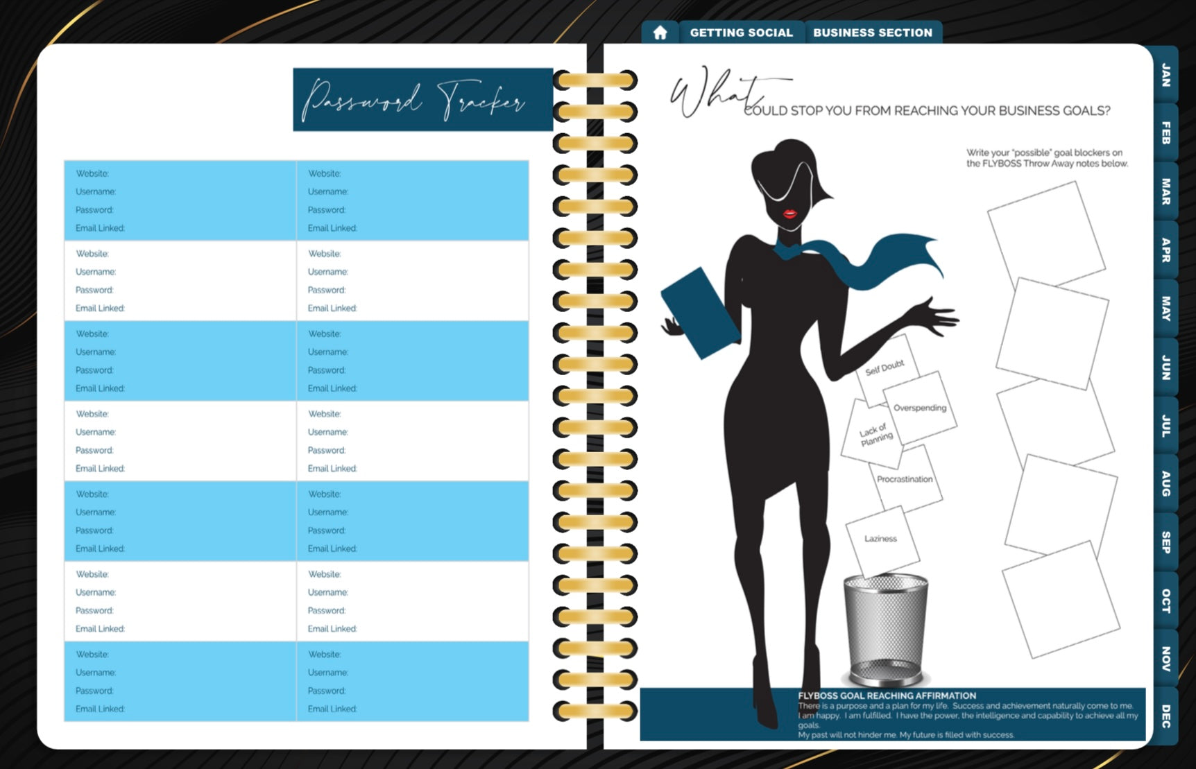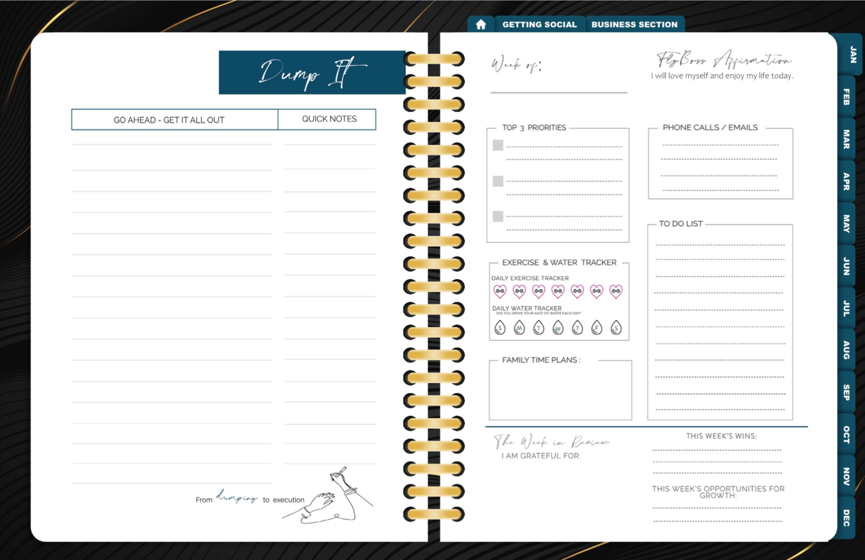 - Bonus Business Planning Section which includes Brain Dump, Project Planner, Social Media Focus Planner, Connection and Networking tracker and so much more